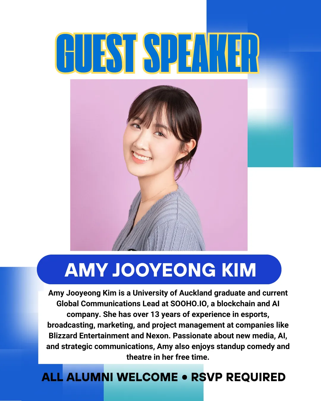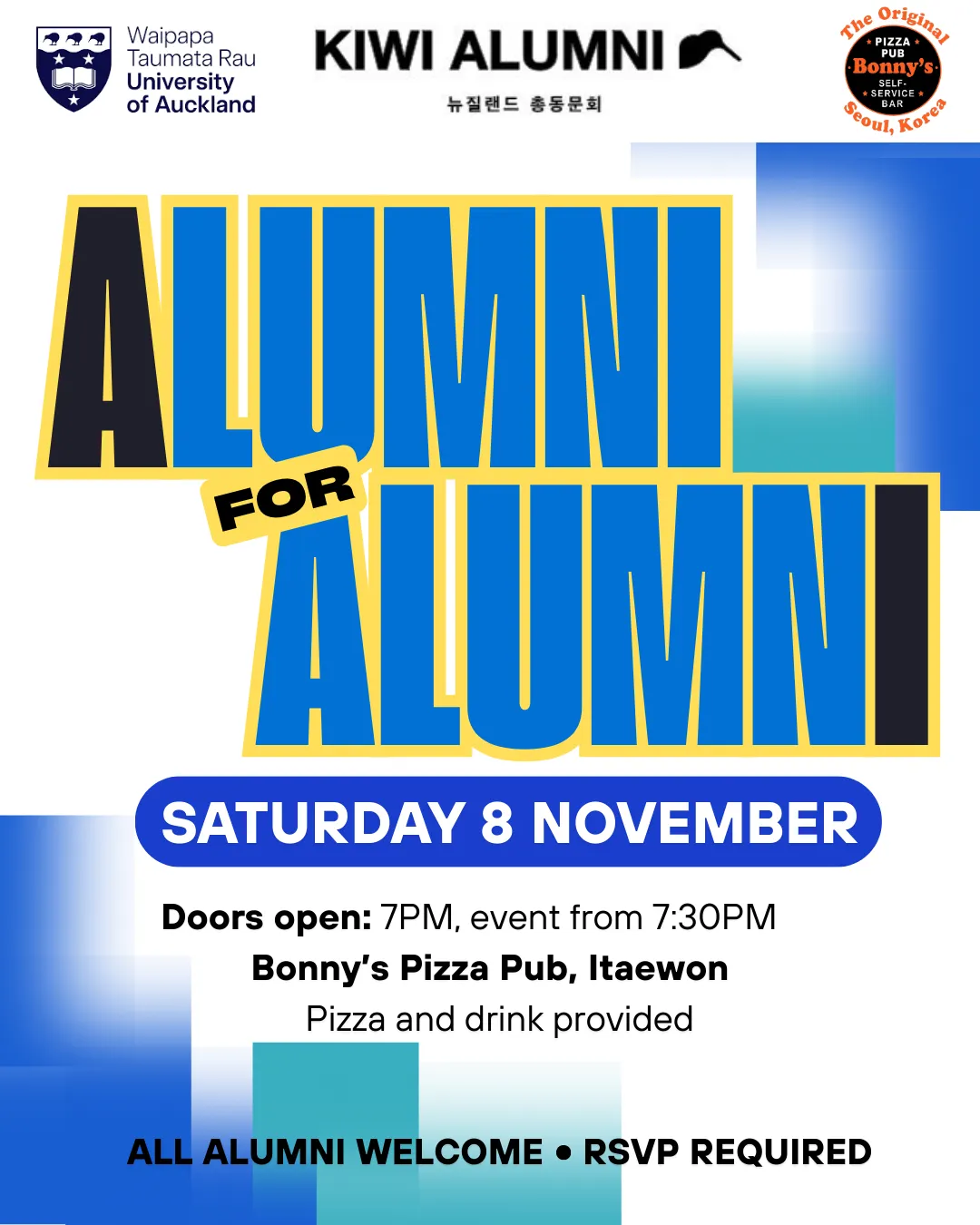 Welcoming all alumni to join us for a special Kiwi Alumni Korea X University of Auckland (UoA) event on Saturday 8 November, in Seoul. Enjoy special activities, including a guest talk from Amy Jooyeong Kim. Complementary drink and pizza provided. Don’t miss this chance to connect, learn, and enjoy a great night out.