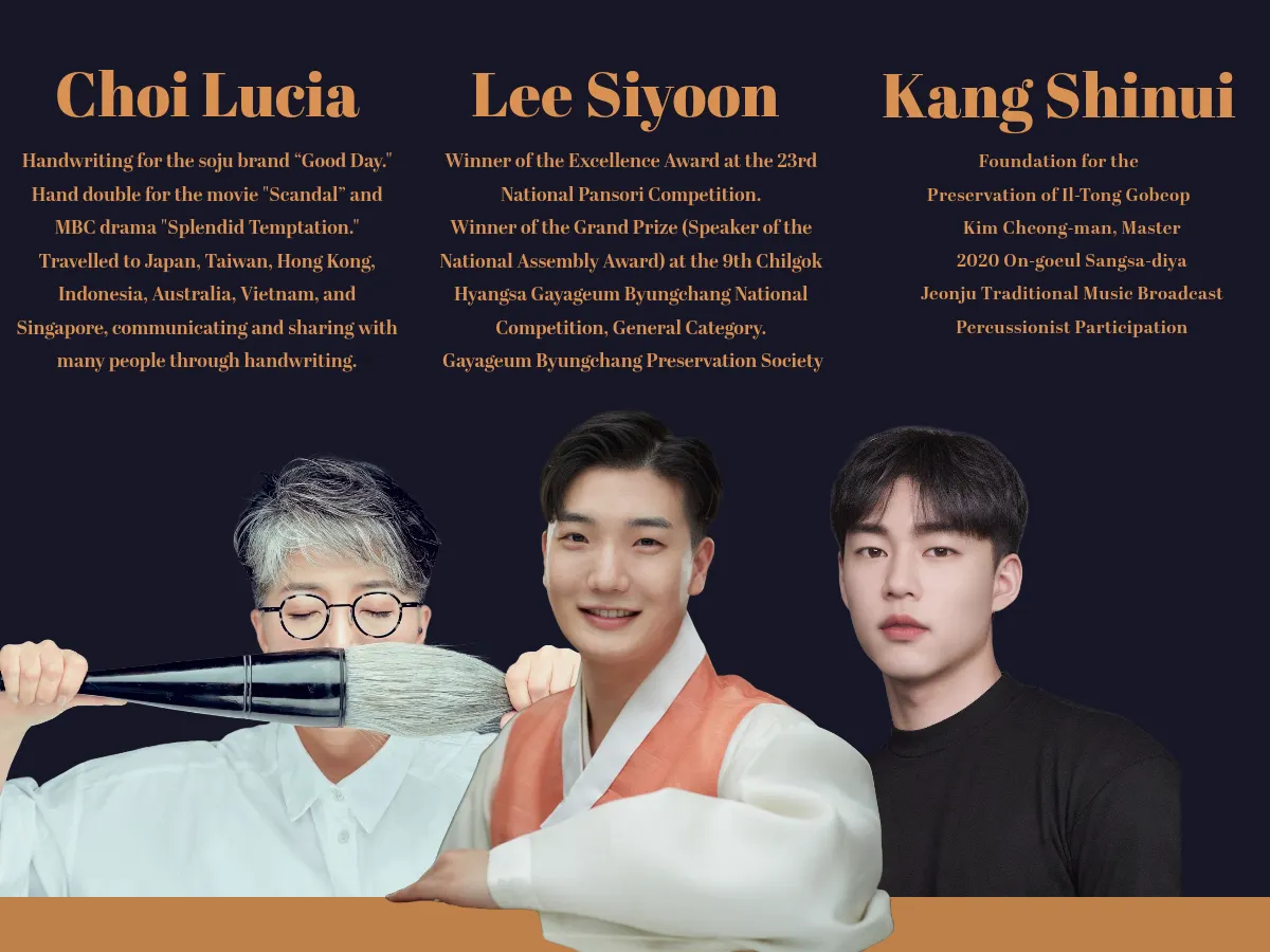 A trio consisting of a Calligraphy Artist, Lucia Choi, a Gayagum Musician, Siyoon Lee, and a percussionist, Shinui Kang, will perform together, embodying both Korean and New Zealand culture.