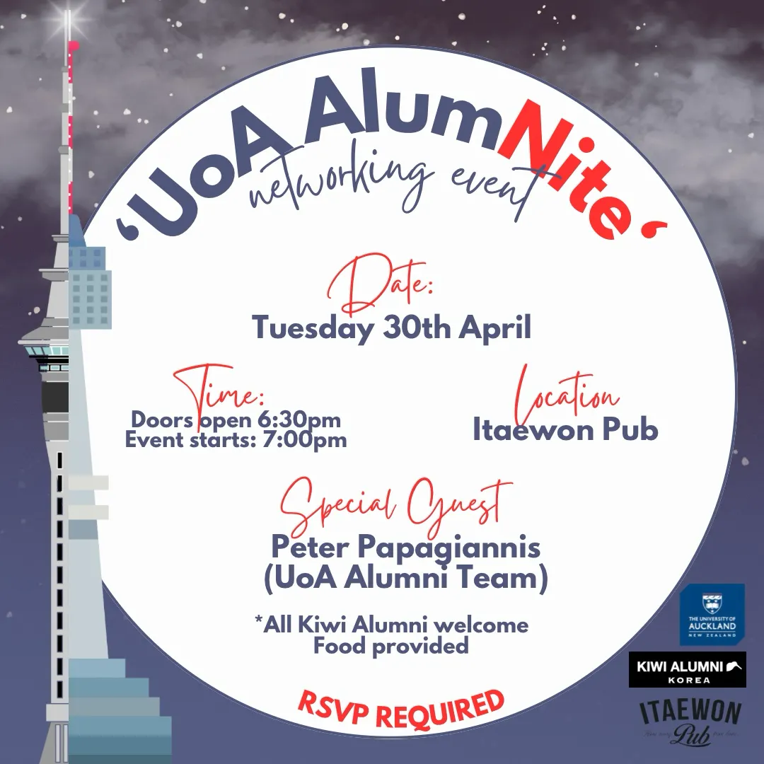In attendance will be Peter Papagiannis, Alumni Relations Manager at the University of Auckland. He will be your quiz master, MC and entertainment for the evening. He is looking forward to reconnecting with the great community of ex-pats and alumni from Kiwi Alumni Korea.