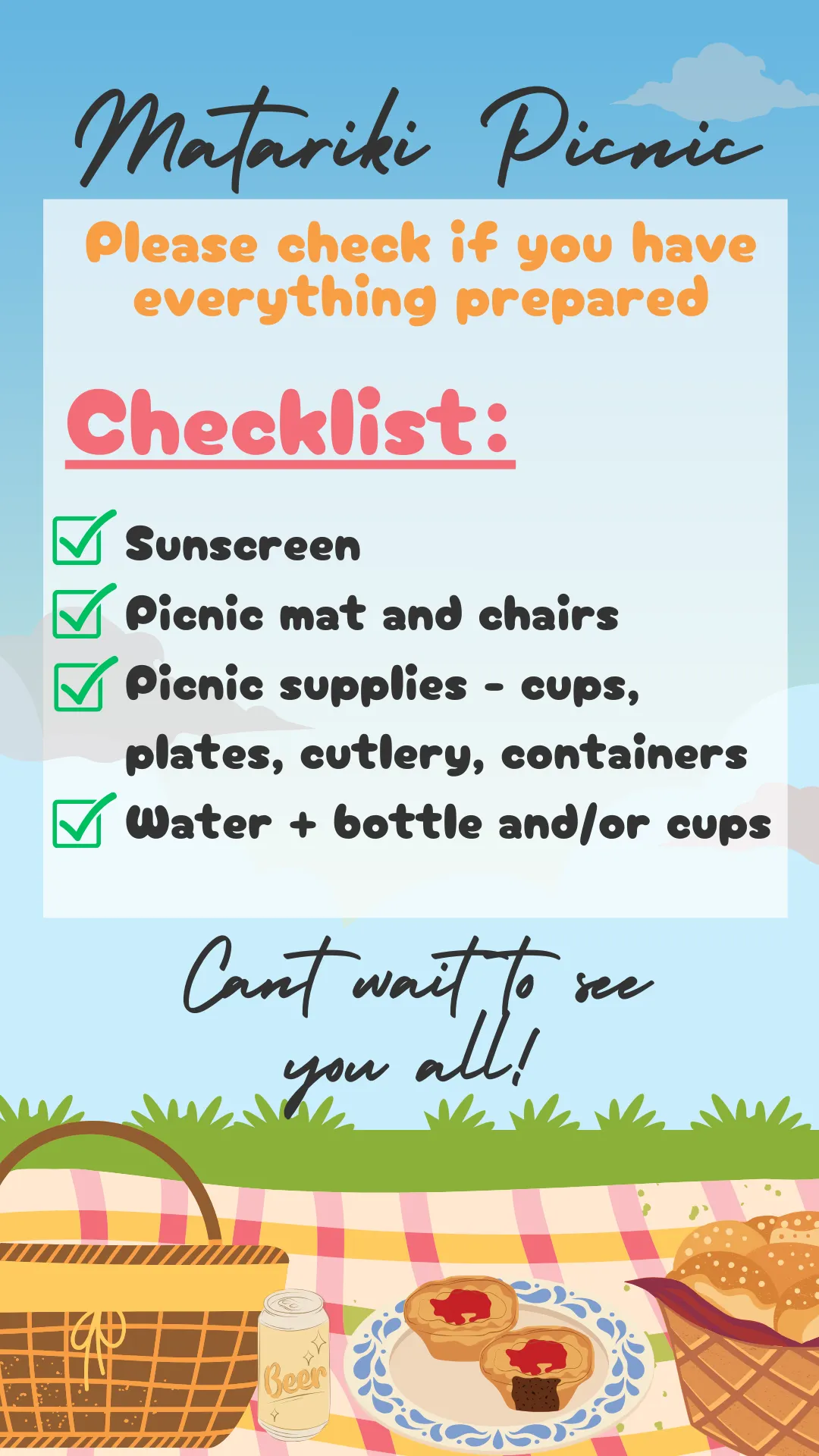 Please bring your own tumblers and picnic supplies! Let’s be tidy kiwis and avoid waste.